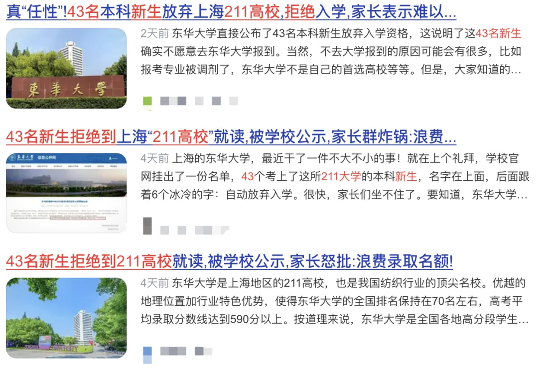 还有自媒体以“43名新生拒绝到211高校就读”为题,在网上转发公告并指责相关学生“任性”。