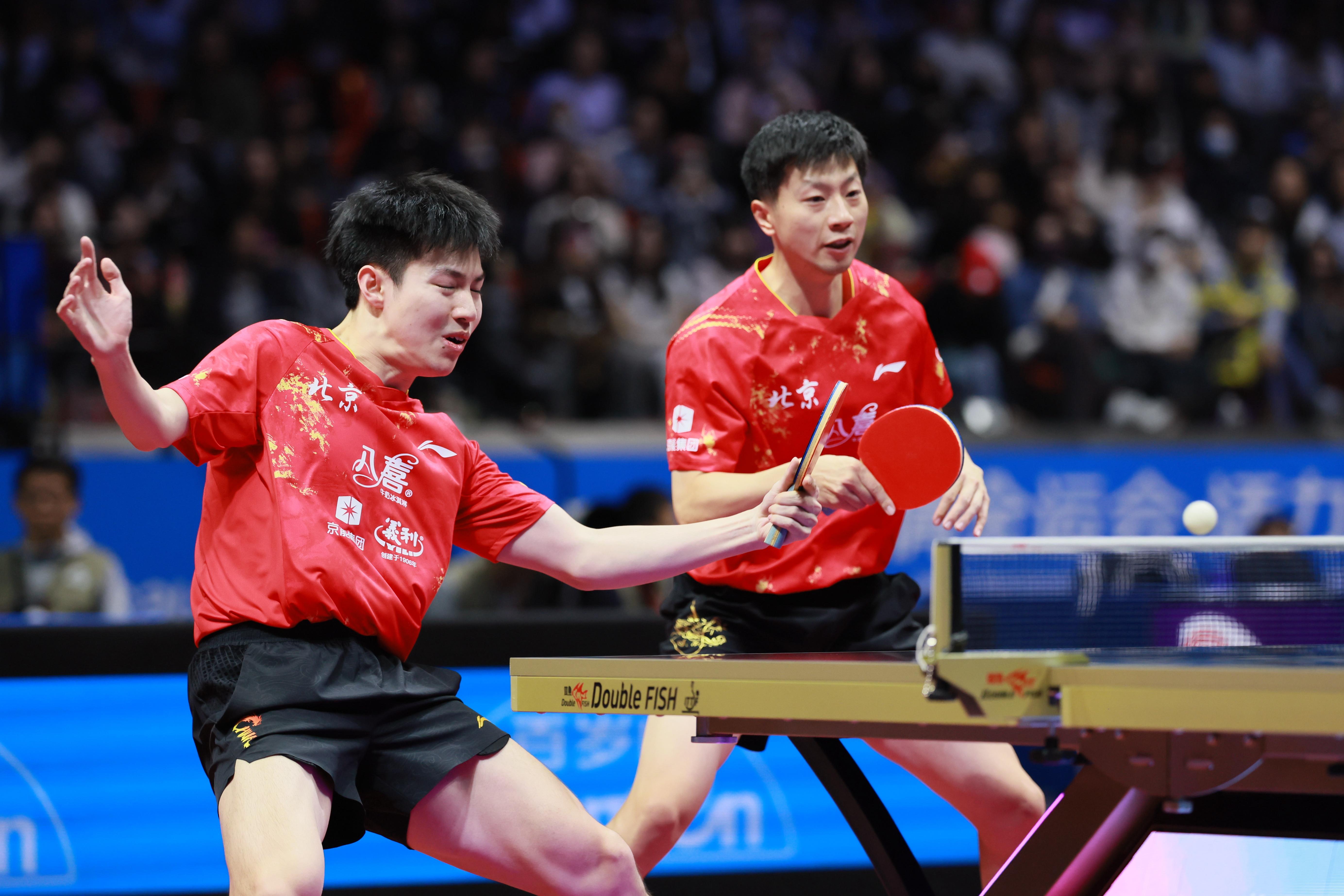 △乒乓球男团半决赛,北京队马龙/黄友政在比赛中。