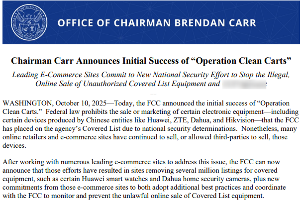 此外,FCC还计划在10月28日投票进一步强化限制,可能禁止授权包含黑名单企业零部件的设备。